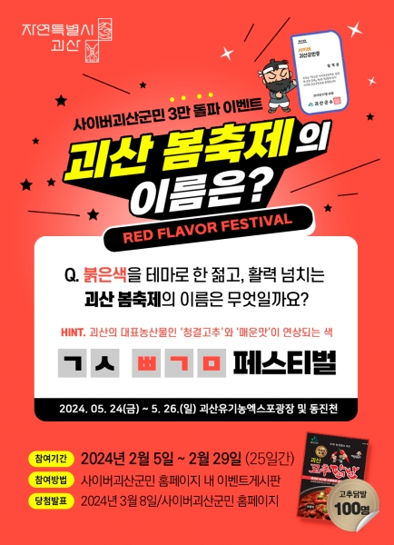 이번 이벤트는 사이버 괴산군민 3만명 돌파 기념과 함께 2024년 처음으로 개최되는 괴산의 봄을 대표하는 젊고 활력 넘치는 축제인 ‘괴산 빨간맛 페스티벌’을 전국적으로 알리기 위해 마련됐다.
