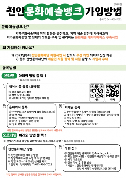 등록 방법은 천안문화재단 누리집과 전자우편 등을 통해 가능하며 온라인 등록이 어려운 원로 또는 장애 예술인은 우편 또는 방문해 접수하면 된다.