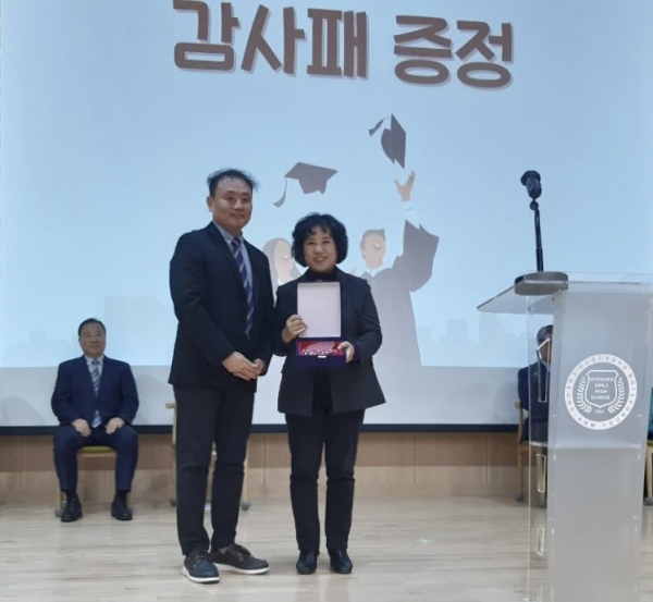 혜성여고는 지난 3년간 음악실 및 과학실 리모델링과 생활체육 증진을 위한 체육교육시설 개선, 정진관·성실관 도장 공사뿐만 아니라 미세먼지 및 공기 정화를 위한 방진시설개선사업비 등을 지원해 학생들의 생활 건강과 학습환경조성에 숨은 조력자 역할을 꾸준히 해온 봉양순 위원장에 대한 공로에 감사패를 수여한다고 밝혔다.