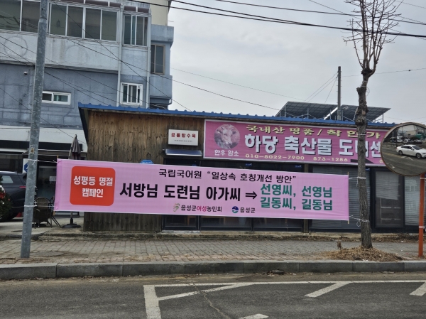음성군여성농민회가 주관한 이번 캠페인은 곧 다가오는 설날을 맞이해 가족 모두가 서로 배려하고 존중하는 성평등한 명절 문화를 실천하기 위해 마련됐으며 9개 읍면 주요 교차로와 시가지 25개소에 서로를 존중하는 성평등한 문구의 현수막을 게시했다.
