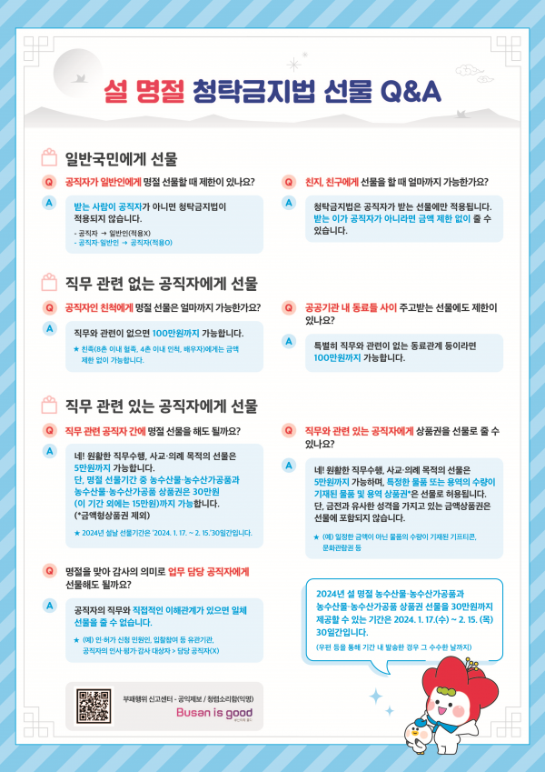 이번 캠페인에서는 설 명절을 앞두고 부정한 선물 수수 예방을 위해 지난해 8월 개정된 청탁금지법 시행령 관련 내용을 알기 쉽게 풀어 쓴 '설 명절 선물 수수 준수사항 Q&A' 홍보물도 배부한다.