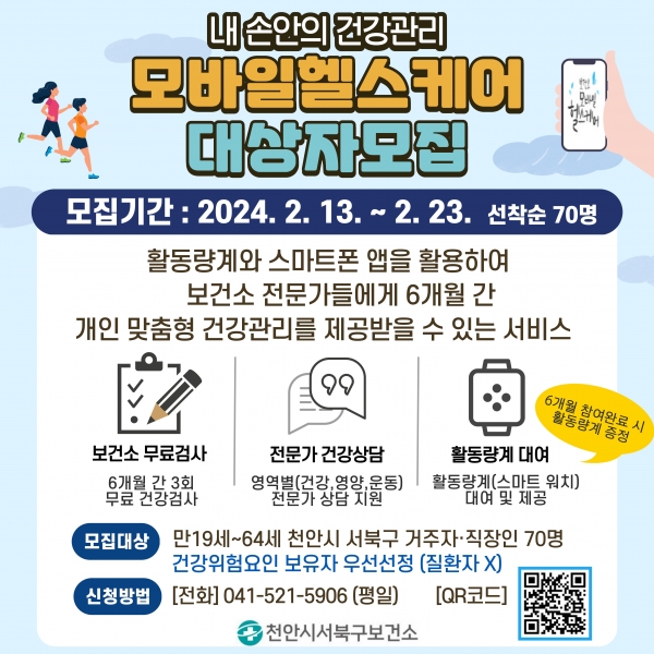 [충청뉴스큐] 천안시 서북구보건소는 오는 23일까지 모바일헬스케어 사업 대상자 70명을 선착순 모집한다고 밝혔다.