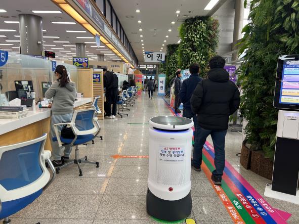 인공지능 방역로봇은 카메라와 센서를 활용해 사물을 인지해 스스로 민원실 공간을 안전하게 자율주행하며 공기정화 뿐만 아니라 바닥까지 살균하는 무인방역서비스를 제공한다.