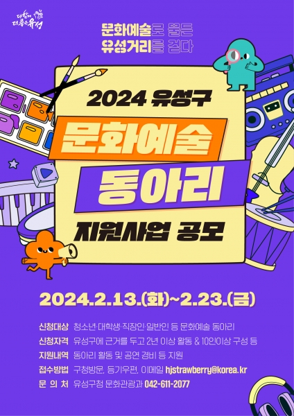 [충청뉴스큐] 대전 유성구는 지역에서 활동하는 청소년·대학생·직장인·일반인 문화예술동아리를 대상으로 23일까지 ‘2024년 문화예술동아리 지원사업’을 신청·접수한다고 13일 밝혔다.