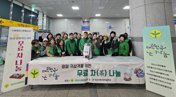 한편 아산시 새마을회는 매년 설날과 추석에 귀성객들을 위한 차 나눔 봉사와 떡국 나눔, 반찬·김장 나눔 등 다양한 나눔 활동을 하고 있다.