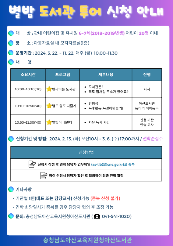 [충청뉴스큐] 충청남도아산교육지원청아산도서관은 2024년 2월 13일 부터 선착순으로 도서관 견학 프로그램‘별밤 도서관 투어’참여기관을 모집한다.