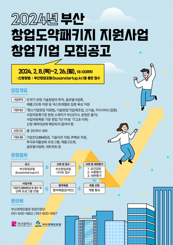 [충청뉴스큐] 부산시는 부산 스타트업의 혁신성장 지원을 위해 올해 처음으로 '부산 창업도약패키지 지원사업'을 추진한다고 밝혔다 '부산 창업도약패키지' 지원사업은 혁신 생각이나 기술을 보유한 업력 7년 미만의 성장가능성 높은 유망 부산 창업기업 20개사 내외를 선발해 기업진단부터 제품·서비스 고도화 등에 투입되는 자금, 상담, 투자유치까지 사업화 전 과정을 지원하는 사업이다.