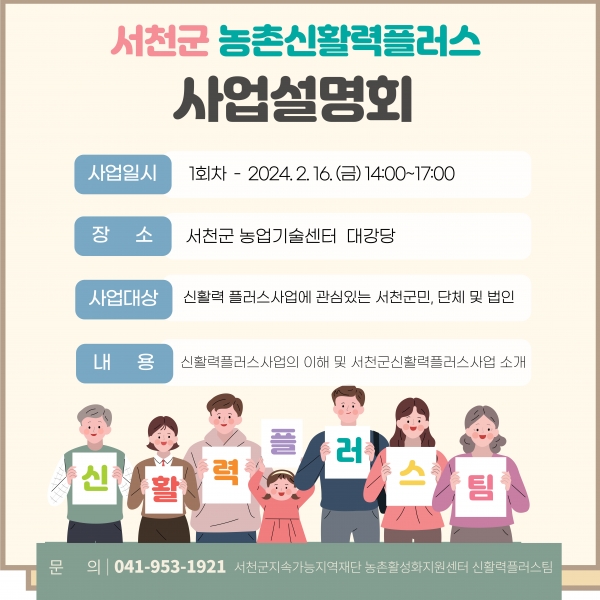 자세한 사항은 서천재단 신활력플러스팀으로 문의하면 된다.