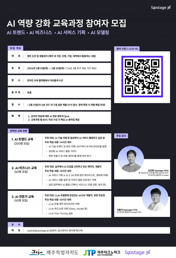 AI 전문가인 업스테이지 김성훈 최고경영책임자와 이활석 최고기술책임자가 강사로 나서 15일부터 오는 29일까지 교육을 담당한다.