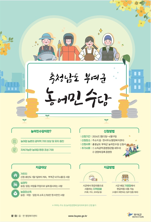 [충청뉴스큐] 부여군은 지역경제 활성화 및 농어업의 공익적 기능 증진을 위해 4월 19일까지 주소지 읍면 행정복지센터에서 2024년 농어민수당을 접수한다.