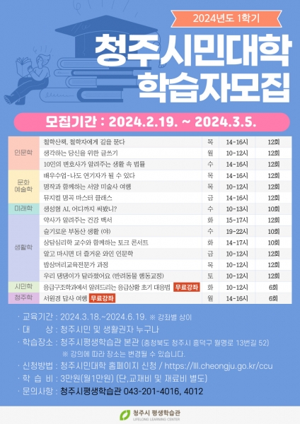 청주시민 누구나 신청 가능하며 오는 3월 5일까지 청주시민대학 홈페이지에서 온라인으로 신청하면 된다.