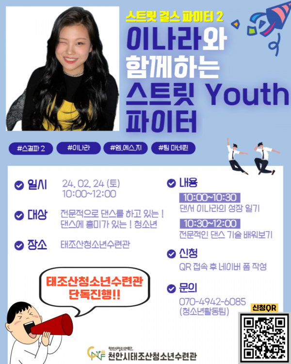 [충청뉴스큐] 천안시청소년재단 천안시태조산청소년수련관은 오는 24일 열리는‘이나라와 함께하는 스트릿 Youth 파이터’참가자를 모집한다고 밝혔다.