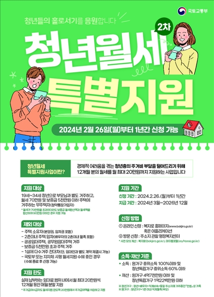 [충청뉴스큐] 대구광역시는 2월 26일부터 경기침체 장기화로 학업에 어려움을 겪고 있는 대학생과 저소득 근로 청년들의 지속적인 주거비 지원 요구를 반영해 2022년부터 한시적으로 시행하던 청년 월세 지원 사업을 2024년부터 2차 사업으로 연장 추진한다.