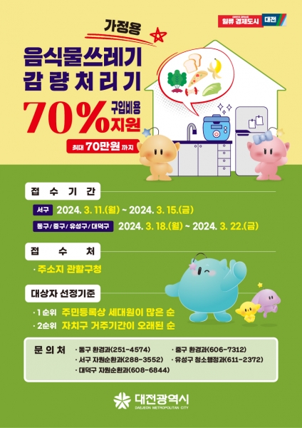 박도현 대전시 환경녹지국장은 “대전시 전체 음식물쓰레기 발생량의 70% 이상이 가정에서 발생하는 만큼 각 가정의 배출단계에서부터 음식물쓰레기를 줄이는 것이 중요하다”며 “이번 감량처리기 설치 지원사업에 2023년 설문조사 결과를 반영, 지원할 계획이니 시민 여러분의 많은 관심을 당부드리며 음식물쓰레기 감량에 적극적으로 동참해 주시길 바란다”고 말했다.