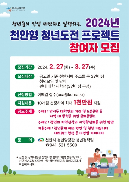 자세한 사항은 천안시 누리집 공고문을 참고하거나 청년담당관 청년정책팀으로 문의하면 된다.