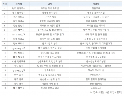 충남 천안시, 경북 포항시, 부산 영도구는 2018년 시범사업에 이어 2019년에도 각각 삼거리 스튜디오, 꿈틀로 문화공판장, 깡깡이예술마을 문화공작소 등의 거점 기능을 공고히 하고 사회적 가치 확산을 위한 사업을 지역 내로 넓혀갈 계획이다.