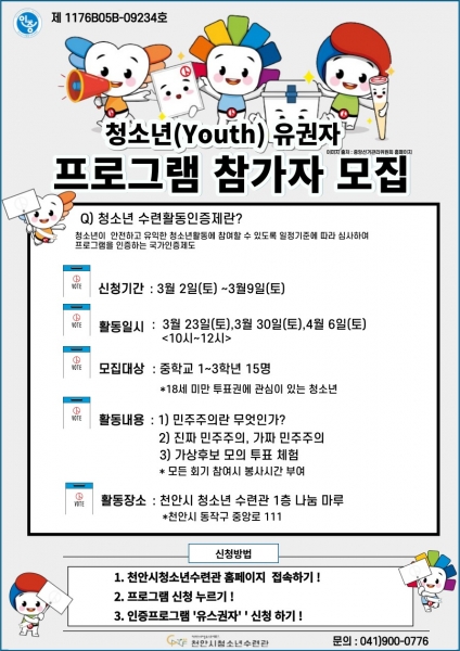 [충청뉴스큐] 천안시청소년재단은 천안시청소년수련관이 오는 9일까지 ‘유스권자’ 프로그램 참가자를 모집한다고 밝혔다.