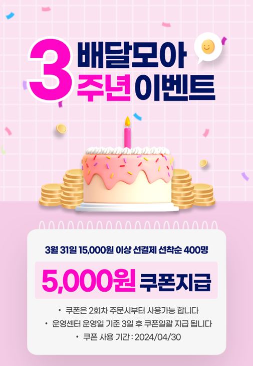 3월 한달동안 매주 월요일 선착순 500명에게 2천원 즉시 할인쿠폰을 제공하고특히 3주년 당일 3월 31일에는 주문자 400명에게 5천원 특별할인 쿠폰을 지급할 예정이다.