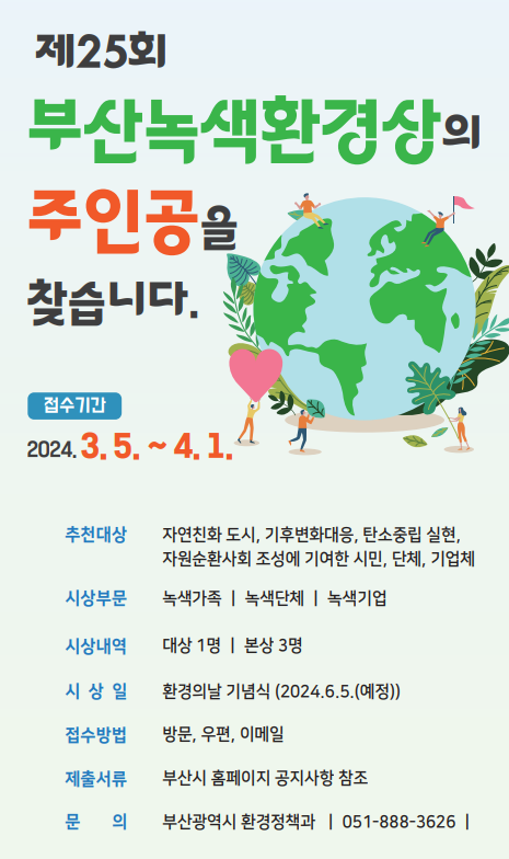 이병석 시 환경물정책실장은 “우리시는 탄소중립 실현과 자연친화 도시 부산을 만드는 데 선도적인 역할을 해주신 개인·단체를 발굴해 부산녹색환경상을 시상하고 있다”며 “부산의 환경을 지키기 위해 열심히 활동하시는 분들의 노고가 널리 알려질 수 있도록, 이번 후보자 모집에 많은 관심과 참여를 부탁한다”고 당부했다.