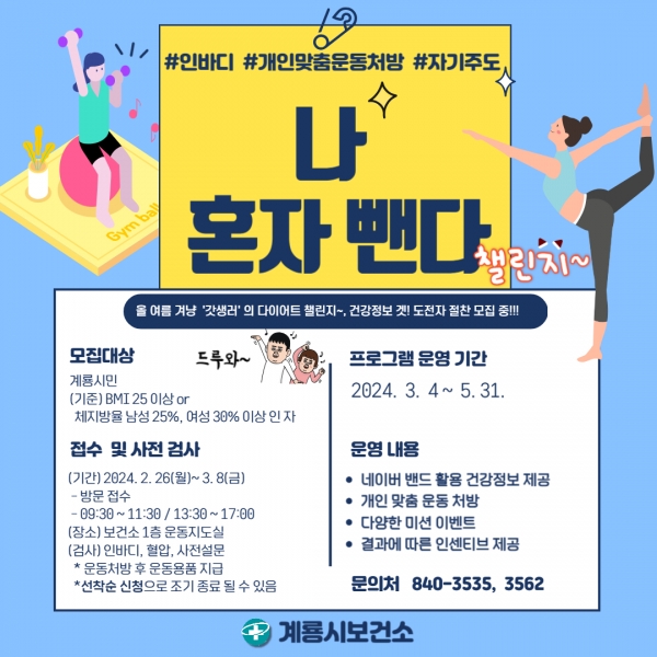 [충청뉴스큐] 계룡시는 3월부터 5월까지 지역주민 신체활동 증진과 비만예방을 위해 ‘나 혼자 뺀다 챌린지’를 운영한다고 밝혔다.