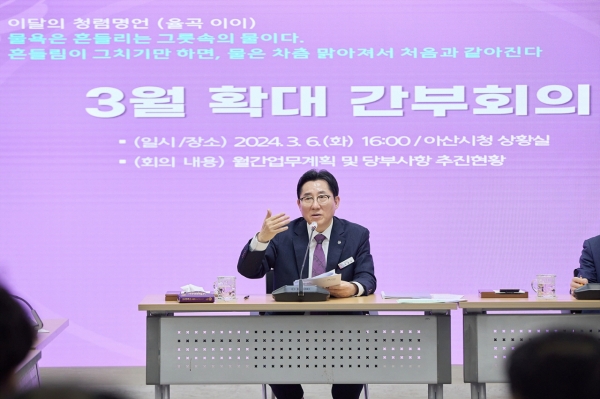 박경귀 시장은 이달(3월)의 ‘청렴톡톡 메시지’로 율곡 이이의 청렴 명언을 전달하며 “탁한 흙탕물도 시간이 지나면 가라앉아 윗물이 맑아지듯이 공직자는 항상 물욕에 흔들리지 않아야 하고 어떠한 유혹과 청탁도 이겨내도록 청렴을 생활화해야 한다”며 시민이 신뢰하는 공직 분위기 조성에 앞장서주기를 당부했다.