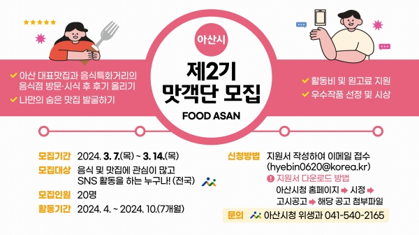 [충청뉴스큐] 아산시는 오는 3월 7일부터 14일까지 시민과 관광객에게 아산의 맛집을 알리고 음식문화를 홍보하는 ‘제2기 아산시 맛객단’을 모집한다.