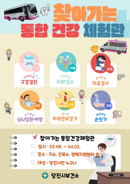 [충청뉴스큐] 당진시보건소는 건강관리 서비스를 받기 어려운 취약 계층과 시민을 대상으로 구강검진 및 맞춤형 건강관리 서비스를 제공하는 ‘찾아가는 통합건강 체험관’을 오는 8일부터 4월 2일까지 운영한다.