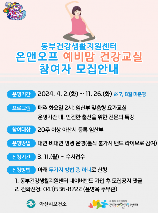 [충청뉴스큐] 아산시 보건소 동부건강생활지원센터는 오는 4월부터 관내 임산부를 위한 ‘온앤오프 예비맘 건강 교실’을 운영한다.