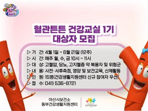 [충청뉴스큐] 아산시 보건소 동부건강생활지원센터는 대사증후군 예방을 위해 ‘혈관튼튼 건강교실 1기’를 운영한다.