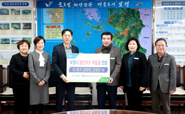 [충청뉴스큐] 보령시는 지난 6일 시장실에서 김동일 시장과 이근욱 NH농협은행 보령시지부장 등 관계자가 참석한 가운데 법인제휴카드 사용 적립금 전달식을 가졌다고 밝혔다.