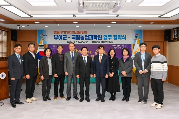 [충청뉴스큐] 부여군은 지난 6일 국립농업과학원 농업생물부와 군청 서동브리핑실에서 밤꿀의 기능성 활용 및 부가가치 향상을 위한 업무협약을 체결했다고 밝혔다.