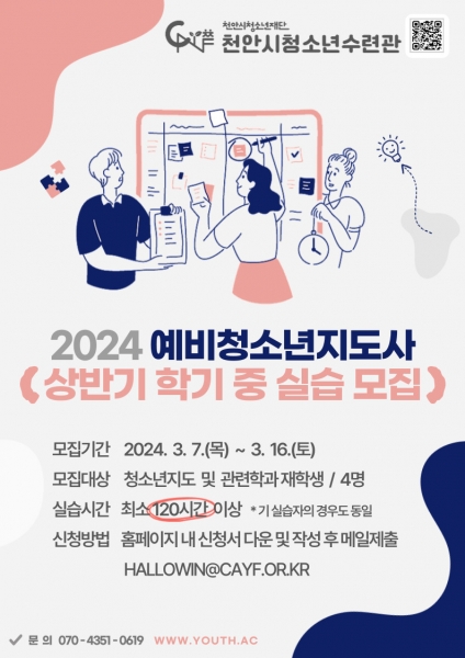 [충청뉴스큐] 천안시청소년재단은 천안시청소년수련관이 예비 청소년지도사 실습에 참여할 실습생을 모집한다고 8일 밝혔다.