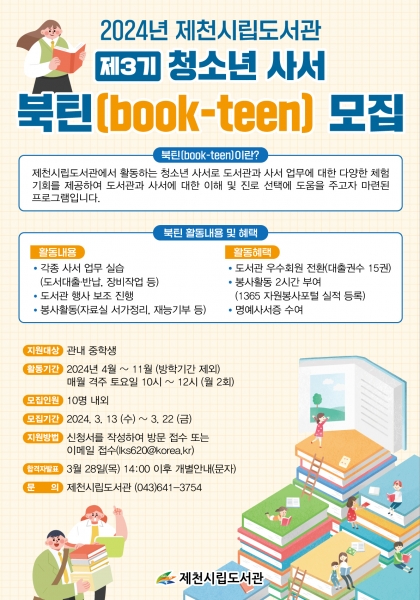 [충청뉴스큐] 제천시립도서관에서는 2024년 제3기 청소년 사서 북틴을 모집한다.