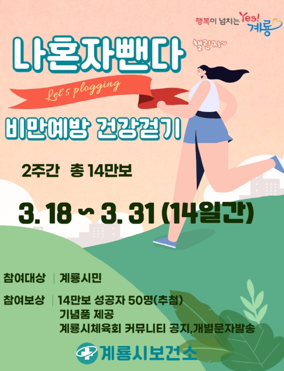 계룡시민이면 누구나 참여 가능한 이번 이벤트는 스마트폰 ‘걷쥬앱’을 통해 신청가능 하며 3월 18일부터 2주간 총 14만보를 걸으면 된다.