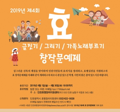 [충청뉴스큐] 인천광역시에서는 청소년의 효 의식 함양과 문예기량을 장려하고, 효에 대한 바른 인식을 키우고자 오는 5월 4일에 문화예술회관에서 ‘제4회 효 창작 문예제’를 개최한다. ‘어버이 날’을 기념해 ‘가족사랑 효행실천’이라는 주제로 글짓기와 그리기, 가족 노래부르기 등 3개 부문으로 나누어 효문예 작품 발표와 경연을 펼친다.