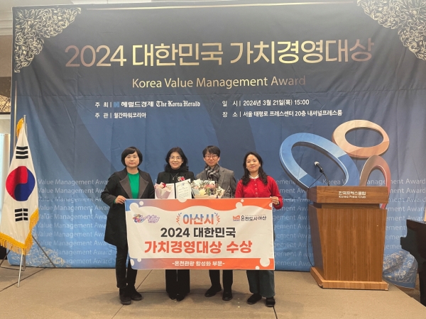 [충청뉴스큐] 아산시가 21일 한국프레스센터에서 열린 ‘2024 대한민국 가치경영 대상’에서 온천산업 활성화 부분 대상을 수상했다.