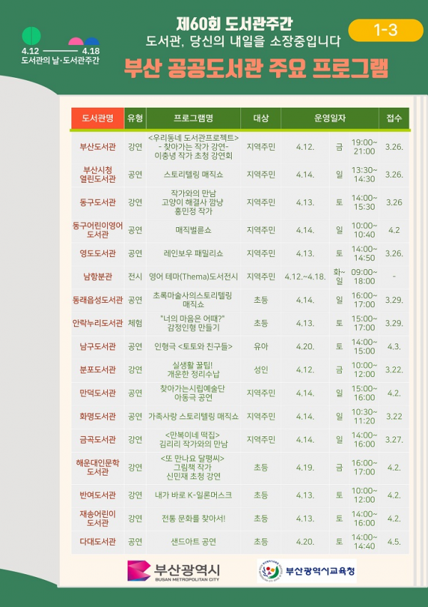 [충청뉴스큐] 부산시는 오는 4월 부산지역 공공도서관에서 '제60회 도서관 주간'과 '제2회 도서관의 날'을 맞아 다채로운 독서문화프로그램을 운영한다고 밝혔다.