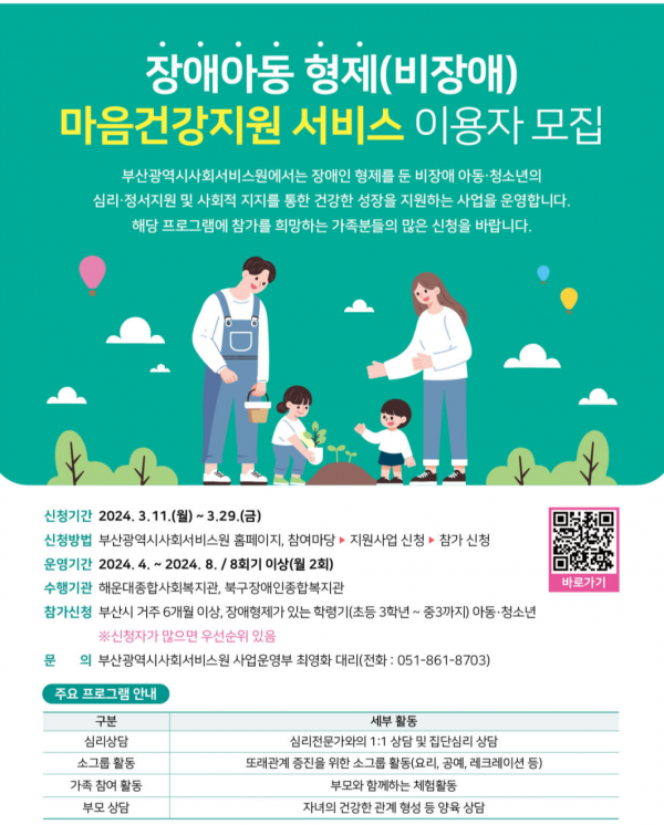 [충청뉴스큐] 부산시는 부산사회서비스원과 함께 올해 신규 사회서비스 시범사업으로 '장애아동 형제 마음건강지원 사업'을 추진한다고 밝혔다.