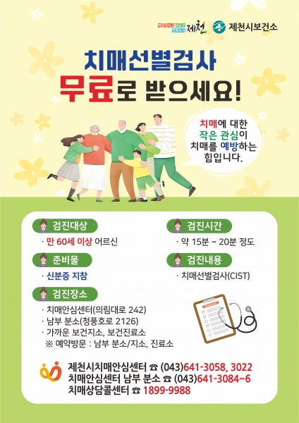 검사를 원하는 사람은 보건소 치매안심센터는 물론, 주소지 담당 보건지소와 보건진료소에서 무료 검진이 가능하며 방문 시 신분증을 지참하면 된다.