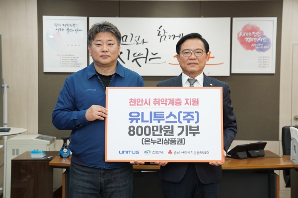 [충청뉴스큐] 천안시 차암동 소재 자동차부품회사 유니투스가 지난 25일 취약계층을 위한 온누리상품권 800만원을 천안시에 기탁했다.