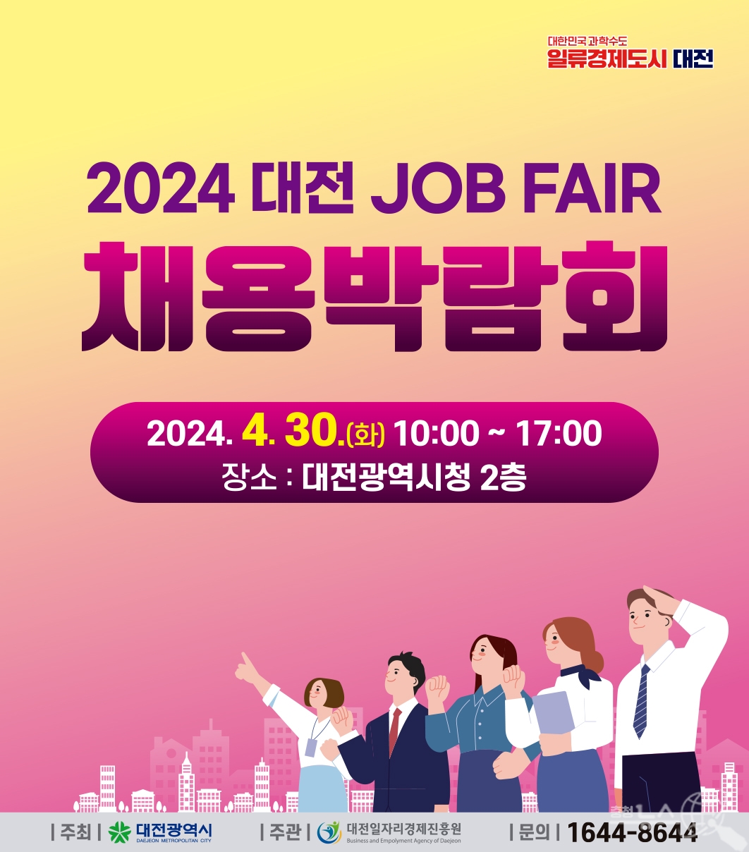 대전일자리경제진흥원(원장 백운교 / 이하 경제진흥원)에서는 4월 30일에 대전시청 2층 로비에서 열리는 「2024 대전 JOB-FAIR 채용박람회」에 참가할 우수 중견·중소기업을 오는 4월 12일까지 모집한다