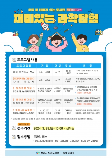 두정도서관 관계자는 “과학의 날을맞아 마련된 과학분야 강좌와 공연을통해 과학을 흥미롭게 접하고 더 나아가 과학적 사고력을 높이는 계기가되었으면 한다”고 전했다.