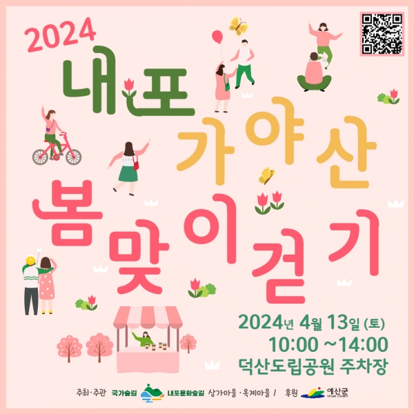 지난해에 이어 올해 두 번째 열리는 이번 걷기 행사는 4월 13일 덕산도립공원 주차장에서 진행되며 가야산의 아름다움을 직접 보고 경험할 수 있도록 체험 및 먹거리부스, 문화공연 등 다채로운 행사가 이어진다.