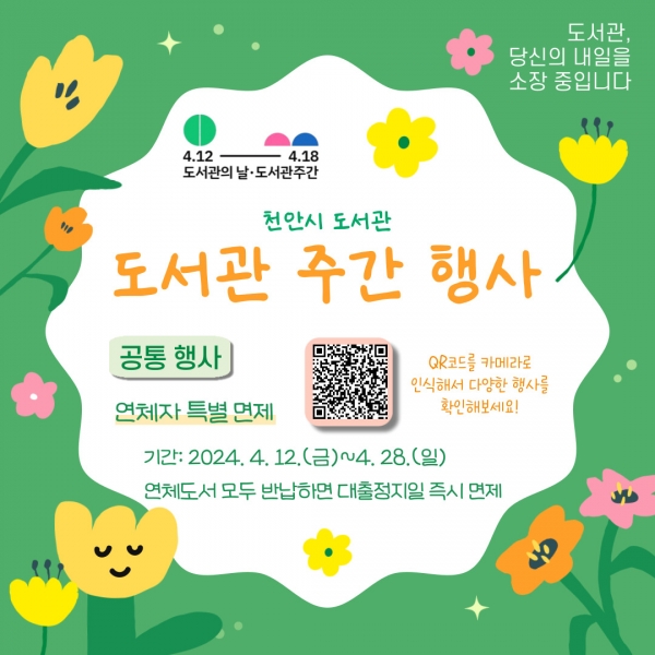 도서관 주간 행사는 천안시 7개 공공도서관 및 14개 공립 작은도서관에서 운영하며 연체자 특별 면제 행사를 공통으로 진행한다.