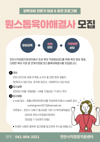 [충청뉴스큐] 천안시직장맘지원센터는 초보 육아 엄마·아빠에게 다양한 육아 정보를 제공하고 함께 맞춤형 해결법을 찾아줄 ‘원스톱 육아해결사’를 모집한다.