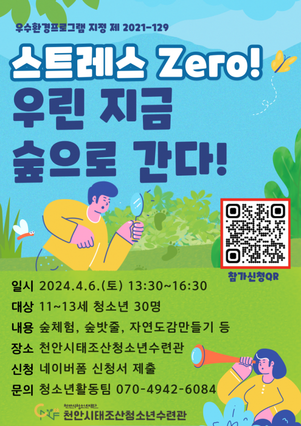 [충청뉴스큐] 천안시청소년재단 소속 천안시태조산청소년수련관이 오는 5일까지 ‘스트레스 Zero 우린 지금 숲으로 간다’ 프로그램 참가자를 모집한다.