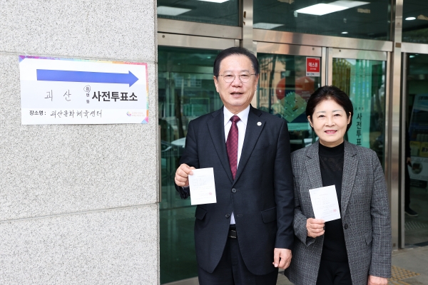 송 군수는 사전투표가 시작된 첫날인 5일 오전 8시 40분경 부인 김 씨와 괴산문화체육센터에 설치된 괴산읍사전투표소에서 투표했다.