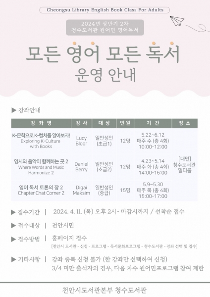 [충청뉴스큐] 천안시 청수도서관은 6월까지 일반 성인을 대상으로 상반기 2차 ‘모든 영어 모든 독서’ 프로그램을 운영한다고 8일 밝혔다.