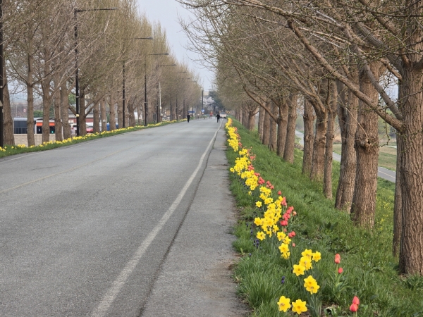 [충청뉴스큐] 아산시 은행나무길 다목적광장[은행나무길화장실~백암배수장 400m 구간]에는 봄의 전령사 수선화와 튤립이 줄지어 만개해 은은한 아름다움을 선사하고 있다.