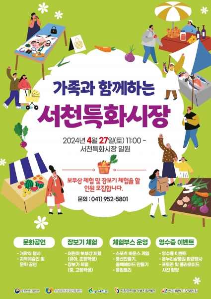 특히 서천특화시장을 방문한 유아와 청소년 500명을 대상으로 보부상 체험과 장보기 체험을 진행하며 참여자 전원에게 온누리상품권 5천원과 장바구니를 지급할 예정이다.